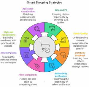 Always check size guides, fabric details, reviews, seller authenticity, prices, and return policies before buying. Also, try to balance trendy fashion with timeless pieces and match your accessories for the best look.