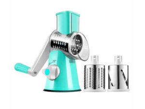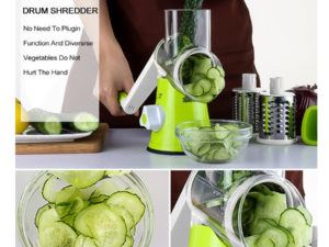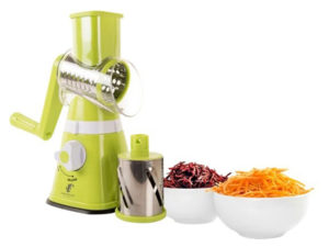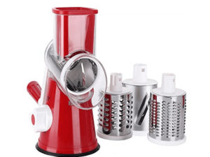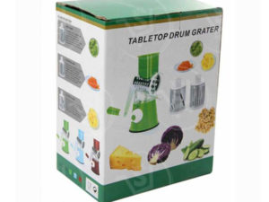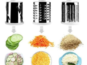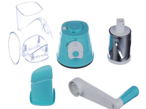 • A fast, efficient hand –powered rotary grater that quickly and easily grates, shreds and slices cheese, vegetables, biscuit, nuts, and more. Featuring a wide hopper that allows substantial quantities of food to be grated or sliced in seconds and a food pusher that keeps fingers away from the blades. Three different stainless steel drum blade deliver fine grating, coarse grating /shredding and slicing. Drum blades switch out for easy cleaning .An angled dispenser reduces any clogging and a suction base securely attaches the unit to a clean , dry, non-porous surface. A reliable and durable does-it –all countertop companion.